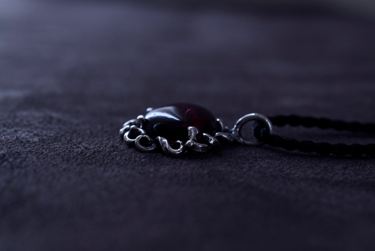 シルバーが落とす深い陰影の中で艶やかな赤い石が静かな輝きを放ち、胸元に一枚の絵画を飾るような佇まい。